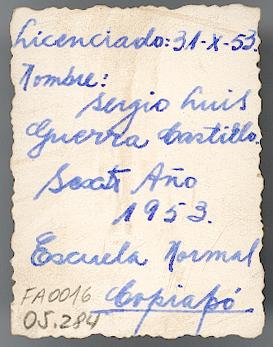 Licenciado: 31-X-53, Nombre: Sergio Luis Guerra Castillo. Sexto año 1953, Escuela Normal, Copiapó.