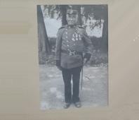 Formato vertical. Figura masculina de pie con los dos brazos al costado del cuerpo , con la manoo izuiqerda sostiene la empuñadura de una espada envainada al cinto. Viste uniforme. En segundo plano un grupo de árboles.