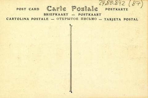 Reproducción impresa, de formato rectangular, en blanco y negro. Posee diferentes características en anverso y reverso, El anverso está dispuesto horizontalmente y se compone por la reproducción de un interior, un vestíbulo fotografiado. En primer plano y en la izquierda se observa un mueble de cuatro paredes y tejado, es de tonalidad gris y diseños vegetales en relieve. En el centro una columna cilíndrica y simple de tonalidad clara. Al costado una vasija de cuello estrecho de tonalidad media con manchas irregulares. A la derecha una escultura clara de animal, un felino, se encuentra sedente y frontal al espectador. En el extremo derecho se observa un farol de metal oscuro que se erige sobre un pilar decorado con volutas. En segundo plano se observa el muro de una edificación de tonalidad clara y líneas horizontales, y vidrios en el costado izquierdo. Posee inscripciones en el borde del extremo inferior de la tarjeta postal dispuestas horizontalmente y escritas con tipología imprenta en negro. Al reverso se dispone horizontalmente y posee diferentes inscripciones con tipología imprenta en negro y de diferentes tamaños, se ubican en la parte superior, en la parte central y en el borde del extremo izquierdo.