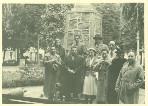 Impresión fotográfica digitalizada, de formato rectangular y disposición horizontal, en blanco y negro. Composición en base a un retrato grupal con diez figuras de pie, masculinas y femeninas, dispuestas frontalmente a la cámara posando. Visten diferentes atuendos, hombres con chaquetas oscuras y mujeres con vestidos y chaquetas. Se encuentran en un parque y junto a una escultura rectangular de piedras; en segundo plano flores claras, árboles y follaje de diferentes características