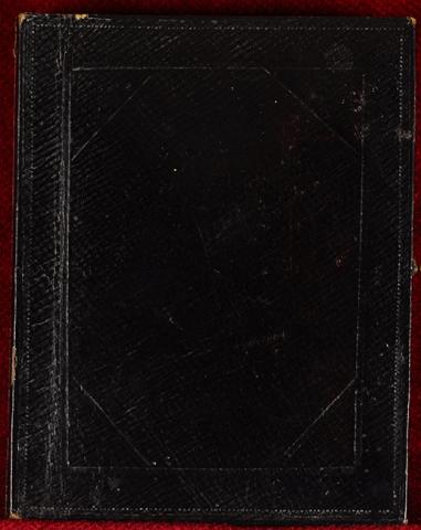 Estuche rectangular de color marrón. Contratapa color celeste y broche metálico en el costado derecho.