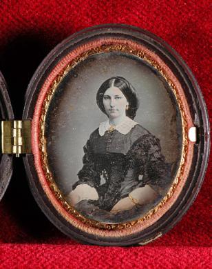 Composición en base a figura femenina de medio cuerpo, sentada de medio perfil hacia su derecha. Lleva vestido con cuello y borde de mangas blancas. El daguerrotipo se encuentra coloreado, destacando el rostro de la mujer con tonos suavemente rosados y marcando las joyas con toques dorados.