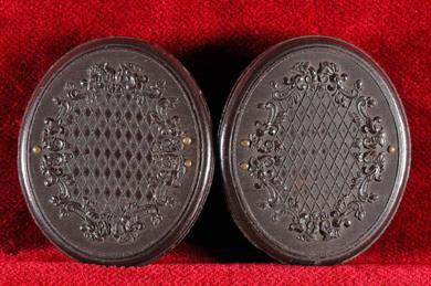 Estuche ovalado de madera color café. Forrado en cuero y terciopelo. Contratapa con terciopelo de color burdeos, con detalle en bajo relieve.