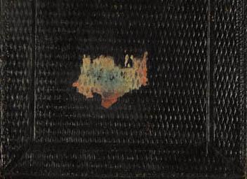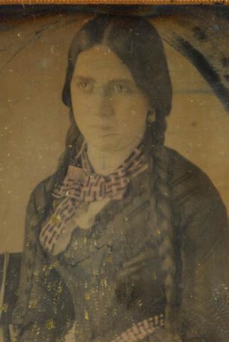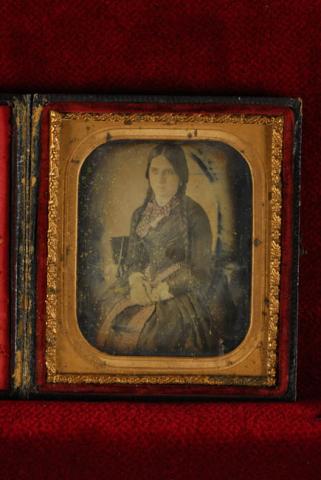 Retrato de mujer en placa metálica, cubierta con vidrio, y sobre el mismo borde dorado en alto relieve.
