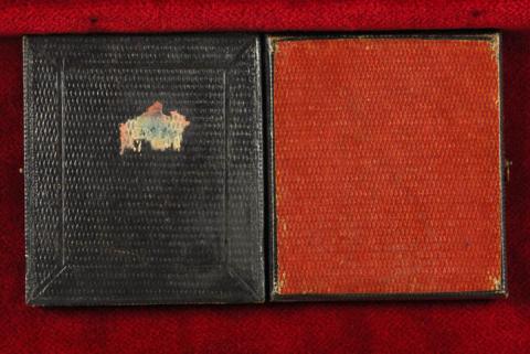 Estuche rectangular, de color café decoración geométrica en relieve. Contratapa color salmon y broche metálico en el costado derecho.