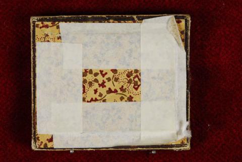 Estuche rectangular en formato horizontal, de color café con papel color beige con decoración fitomorfa en colores burdeos y verde-ocre, adherido a la cubierta.