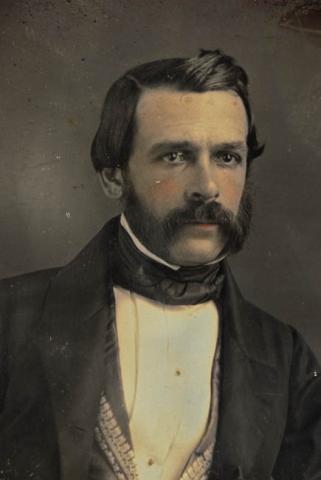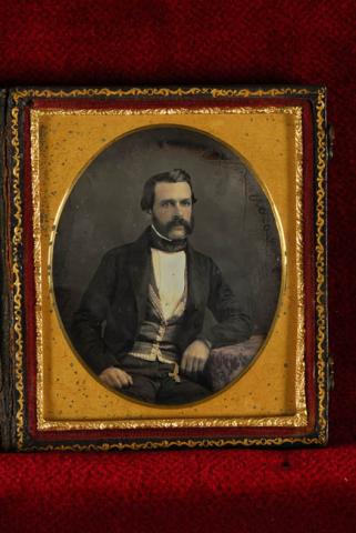 Retrato de hombre en placa metálica, cubierta con vidrio, y sobre el mismo borde dorado en alto relieve.