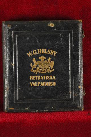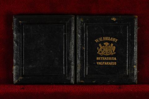Estuche rectangular, de color café con inscripción bajo relieve y dorado del escudo nacional y la autorñia del retrato. Contratapa color burdeos y 2 broches metálicos en el costado derecho.