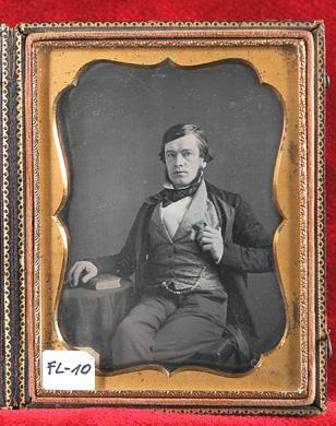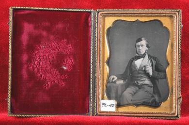 Retrato de hombre no identificado en placa metálica, cubierta con vidrio, y sobre el mismo espaciador dorado nonpariel.