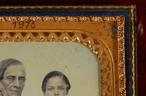 Retrato de hombre y niño en placa metálica, cubierta con vidrio, y sobre el mismo espaciador dorado doble elíptico.