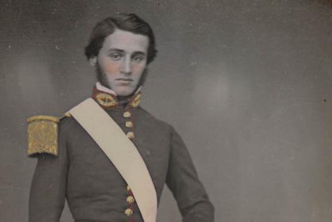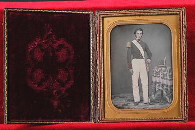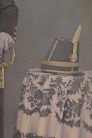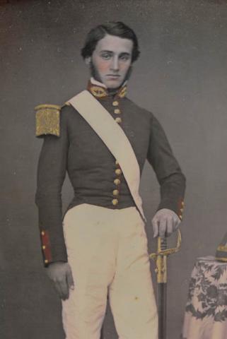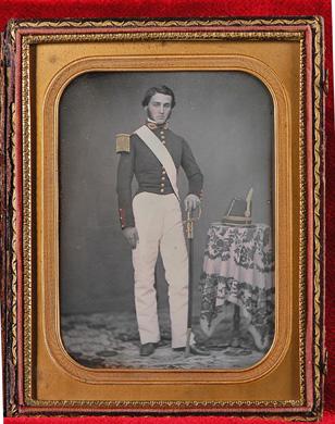 Detalle de banda blanca habla de un militar, quizás doctor, que desempeñó sus funciones cerca de 1860, período de la expansión de la Araucanía. El morrión que se sitúa sobre la mesa, es más alto que los utilizados durante la Guerra del Pacífico, por lo tanto la fotografía es previo a ella. El peinado y las patillas son detalles cercanos a 1860, pero que no representan una definición en cuanto a la datación por sí mismos.