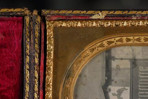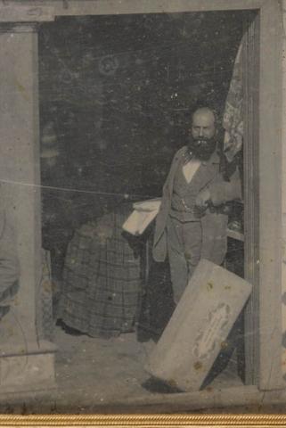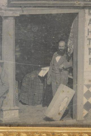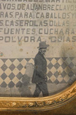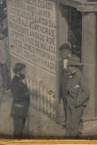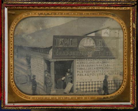 Vista de un almacén ubicado en una esquina en placa de cobre pulida, cubierta con vidrio, y sobre el mismo borde dorado en alto relieve.