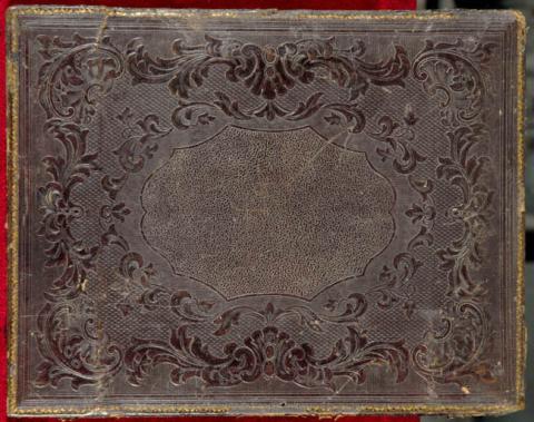 Estuche de madera rectangular, de color café decoración fitomorfa en relieve y forrado en cuero y terciopelo. Contratapa color rojo y broches metálico en el costado derecho.