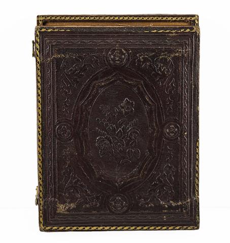 Estuche rectangular de color marrón con decoración fitomorfa en relieve. Contratapa color beige.