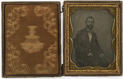 Retrato de hombre en placa metálica, cubierta con vidrio, y sobre el mismo espaciador dorado nonpariel.