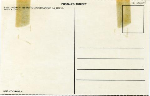 | POSTALES TURISET. PATIO INTERIOR DEL MUSEO ARQUEOLÓGICO. LA SERENA. FOTO: R. GELCIC. LORD COCHRANE 4. | Reverso |