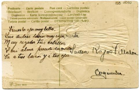 Impreso, policromo, estructura formal retrato de grupo, especialidad fotográfica artística. Al centro en plano general un hombre rodea con uno de sus brazos y besa a una mujer que sostiene un rama de árbol.