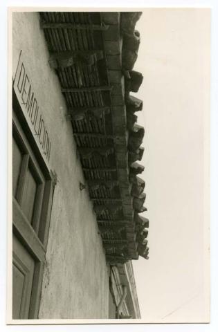 Detalle de una antigua casa ubicada en sector de Cordovez con O'Higgins y que fue demolida. Se observa parte de la cornisa y de una puerta sobre la cual hay un letrero que dice "demolición". Lugar: La Serena (Chile). Materia: Arquitectura y urbanismo. Obras de derribo.