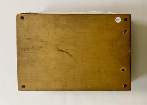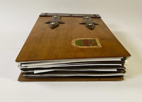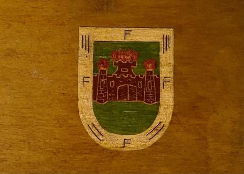 En la esquina superior derecha de la cubierta delantera se encuentra un escudo de forma española con bordura, ejecutado mediante incrustación de madera y pintura. El campo, de color verde, contiene una figura central de un castillo almenado de tres torres en color rojo oscuro. Cada torre —la central más elevada y ancha— está coronada por llamas rojas. La bordura, de madera clara, presenta cuatro letras “F” mayúsculas en rojo, ubicadas en los flancos y en la parte superior e inferior del escudo. En los ángulos superiores se disponen tres líneas paralelas, y en los inferiores, dos líneas paralelas.