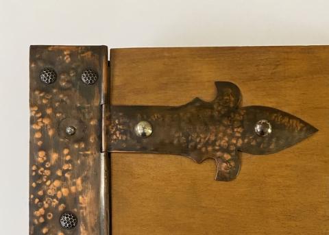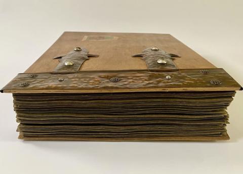 Las cubiertas son de madera, con revestimiento interior de papel. La tapa anterior presenta, en el borde izquierdo, una sección rectangular de metal martillado con pátina oscura que deja entrever tonos cobrizos. Esta pieza está unida a la madera mediante dos bisagras decorativas del mismo material. Cada hoja de bisagra termina en forma de flecha, con dos alas laterales curvas y puntiagudas, y está sujeta con tornillos de cabeza pulida. Tanto esta sección metálica como las cuatro esquinas de la tapa posterior incluyen remaches metálicos decorativos.
