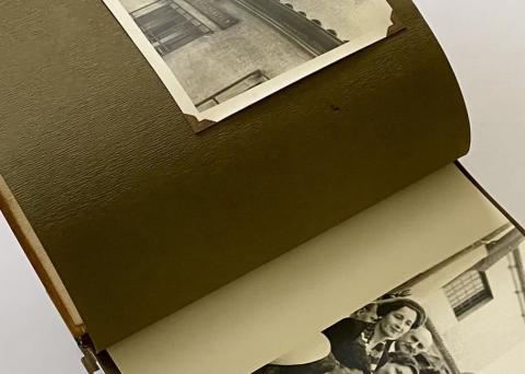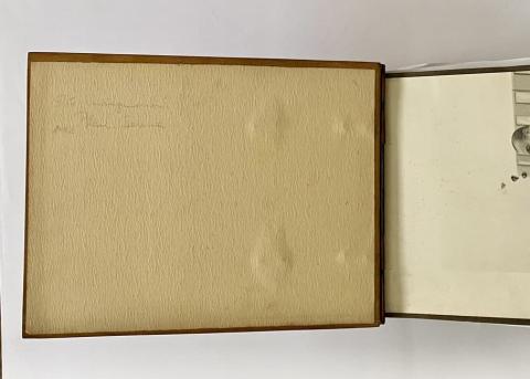 Libro compuesto por cincuenta páginas apaisadas de cartón delgado y corrugado, de color verde oscuro y sin inscripciones. Está encuadernado con dos tornillos metálicos que atraviesan ambas tapas y el cuerpo del volumen, fijados con tuercas en el reverso. Contiene setenta y siete fotografías en blanco y negro, de formato rectangular y dimensiones variables, dispuestas una por hoja. Algunas imágenes están adheridas por uno de sus bordes, mientras que otras están montadas mediante esquinas fotográficas. El volumen incluye también páginas sin fotografías o restos de imágenes que han sido retiradas.