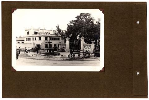 Copia fotográfica en blanco y negro, de formato rectangular y orientación horizontal. La imagen muestra una vista urbana en la que, en primer plano, se encuentra una fuente de varios niveles, rodeada por bancas, ubicada en el extremo de una calle. Parte del suelo a su alrededor tiene montículos de tierra y escombros esparcidos. Algunas personas permanecen de pie o sentadas cerca de la fuente. Hacia la derecha, se observa la entrada hacia un área arbolada de follaje denso, compuesto por dos pilares con remates ornamentales. Estos pilares se extienden lateralmente en muros bajos con celosías decorativas de formas geométricas y jarrones de jardín. En segundo plano, cruzando la calle, se observa un edificio con una sección de dos niveles en la parte delantera y otra de de tres niveles en la parte posterior. Sus fachadas destacan por la alineación de sus ventanas y los remates decorativos en la parte superior, que incluyen balaustradas, pináculos y óculos. En el fondo, el cielo es de tonalidad clara y uniforme.