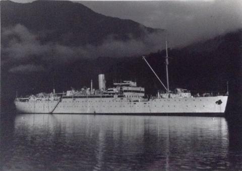 Copia fotográfica en blanco y negro, de formato rectangular y orientación horizontal. En el centro de la imagen, se observa de perfil un buque de gran tamaño orientado hacia la derecha, sobre aguas tranquilas que reflejan parcialmente su silueta. La embarcación, de casco claro, presenta múltiples niveles estructurales, un mástil vertical, una chimenea cilíndrica y diversos equipos en cubierta. Al fondo, se alzan montañas cubiertas de vegetación densa, parcialmente ocultas por nubes bajas o bruma. La escena transcurre en un entorno natural lacustre o de fiordo, en condiciones de escasa luz ambiental. La fotografía está adherida a una hoja de álbum, y bajo ella se distingue una inscripción manuscrita en tinta negra, de carácter identificatorio.