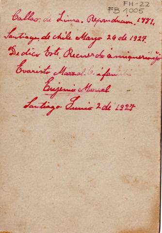 Callao de Lima. Reproducción 1881 / Santiago de Chile. Marzo 26 de 1927 / Dedico este recuerdo a mi [ilegible] Evaristo Marzal G. i Familia / Eugenio Marzal /Santiago Junio 2 de 1927.