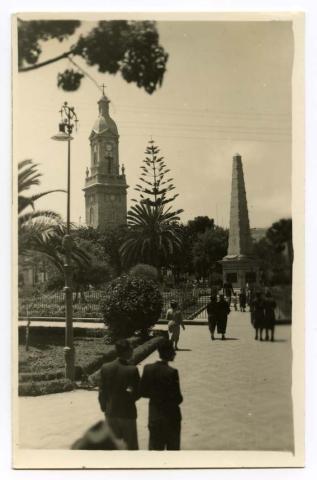 Vista de la plaza se armas de La Serena. Se observa varias personas caminando, un poste de iluminación, el antiguo obelisco, varios árboles y plantas y detrás de este conjunto, a la izquierda, el campanario de la catedral. Lugar: La Serena (Chile). Materia: Arquitectura y urbanismo. Plazas.