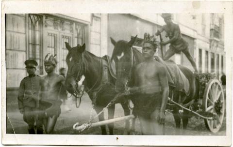 Positivo, monocromo, estructura formal escena, especialidad fotográfica registro. Vista en plano americano de un grupo de hombres que escoltan un carro, tirado por caballos. Arriba de éste un hombre apoya su cuerpo en una vara..