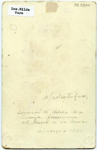 Positivo, monocromo, formato cabinet, estructura formal retrato individual, especialidad fotográfica registro. Vista parcial en plano americano y frontal a mujer. Se presenta de pie con vestimentas muy decoradas y cabellos tomados hacia atrás. Apoya su mano derecha en el borde del respaldo de una silla.