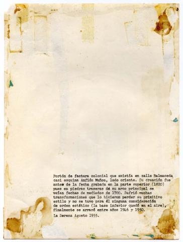 PORTÓN DE FACTURA COLONIAL QUE EXISTÍA EN CALLE BALMACEDA CASI ESQUINA ANFIÓN MUÑOZ, LADO ORIENTE. SU CREACIÓN FUE ANTES DE LA FECHA GRABADA EN LA PARTE SUPERIOR (1820) PUES EN PIEDRAS TRASERAS DE SU ARCO PRINCIPAL SE VEÍAN FECHAS DE MEDIADOS DE