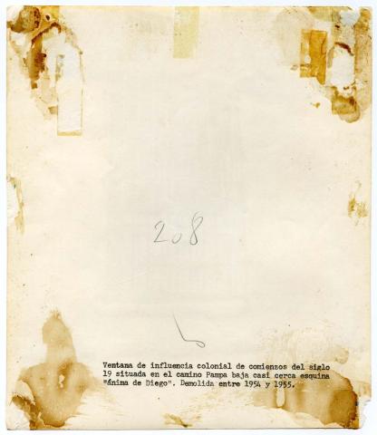 VENTANA DE INFLUENCIA COLONIAL DE COMIENZOS DEL SIGLO 19 SITUADA EN EL CAMINO PAMPA BAJA CASI ESQUINA "ÁNIMA DE DIEGO". DEMOLIDA ENTRE 1954 Y 1955.