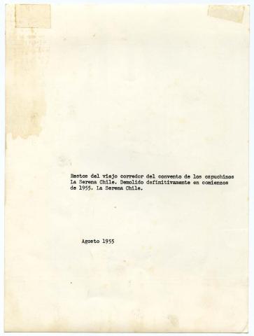 RESTOS DEL VIEJO CORREDOR DEL CONVENTO DE LOS CAPUCHINOS LA SERENA CHILE. DEMOLIDO DEFINITIVAMENTE EN COMIENZOS DE 1955. LA SERENA CHILE. / AGOSTO 1955.