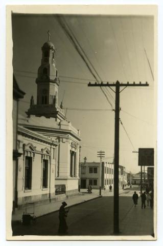 Vista, hacia el sur, de la calle Balmaceda. Se aprecia la intersección con calle Eduardo de la Barra, un barrendero en la calle y otras personas caminando Más atrás. Lugar: La Serena (Chile). Materia: Arquitectura y urbanismo. Calles.