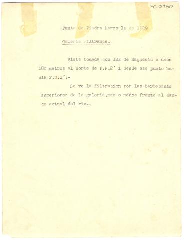 PUNTA DE PIEDRA MARZO 16 DE 1929 / GALERÍA FILTRANTE / VISTA TOMADA CON LUZ DE MAGNESIO A UNOS 180 METROS AL NORTE DE P.N.2´ i DESDE ESE PUNTO HACIA P.N. 1´. / SE VE LA FILTRACIÓN POR LAS BARBACENAS SUPERIORES DE LA GALERÍA, MÁS O MENOS FRENTE AL