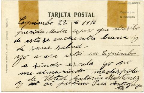 | TARJETA POSTAL. ESPACIO PARA ESTAMPILLA. PROPIEDAD DE CARLOS A. ALVAREZ- COQUIMBO- CASILLA 75. | Reverso |