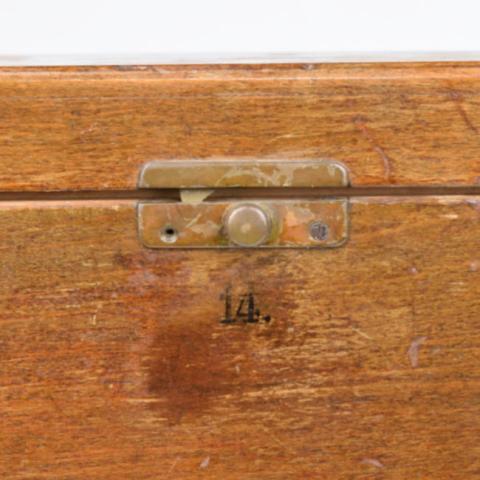 Las diapositivas están almacenadas en una caja con ranuras para evitar que se golpeen. En la tapa de la caja hay una almohadilla de madera forrada en paño verde que sujeta todo el conjunto de placas al cerrar la caja.