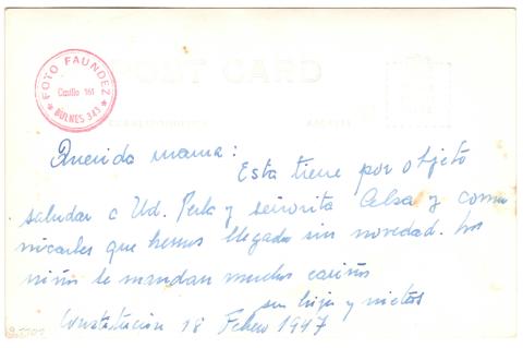 Esta tiene por objeto saludar a Ud. Perla y señorita Celsa y comunicarles que hemos llegado sin novedad. Los niños le mandan muchos cariños su hija y nietos Constitución 18 de Febrero 1947 |
