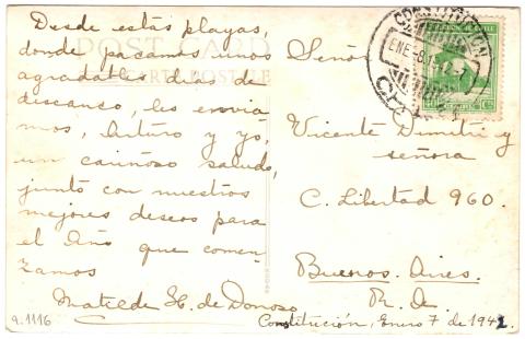 donde pasamos unos agradables días de descanso, les envia- mos, Arturo y yo, un cariñoso saludo, junto con nuestros mejores deseos para el Año que comen_ zamos Matilde H. de Donoso Constitución, Enero 7 de 1942 |