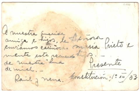 María Prieto e hijos Presente A nuestra querida amiga e hijos, le enviamos cariñosa mente este recuerdo de nuestra "luna de miel.- Raúl y Nena Constitución; 1° XII/33 |