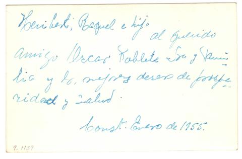 al querido amigo Oscar Poblete Sra y Fami_ lia y los mejores deseos de prospe_ ridad y salud Const. Enero de 1955 |