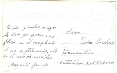 pedro Concha y Diamantina A mis queridos amigos les deseo que pasen muy felices, en el cumpleaño de su matrimonio, y to_ do el resto de sus vidas. Margarita Garrido Constitución 2 de II de 1950 |