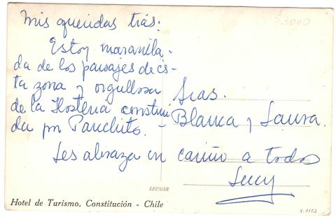 Blanca y Laura Mis queridas tías: Estoy maravilla- da de los paisajes de es- ta zona y orgullosa de la Hosteria construi da por Panchito. Les abraza en cariño a todos Lucy |